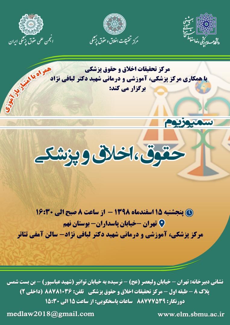 مرکز تحقیقات اخلاق و حقوق پزشکی با همکاری مرکز پزشکی آموزشی و درمانی شهید دکتر لبافی نژاد ، سمپوزیوم حقوق ، اخلاق و پزشکی را با امتیاز باز آموزی برگزار می کند